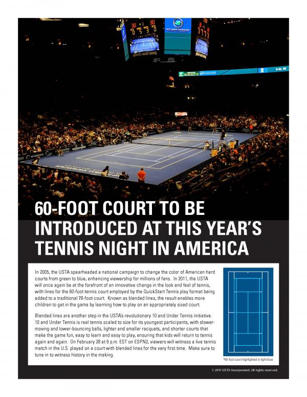 The USTA and event producers StarGames and MSG Sports, announced that, for the first time in history, 60-foot blended lines will be placed on a traditional 78-foot regulation court being used for a pro tennis match. The matches, featuring Ivan Lendl vs. John McEnroe and Pete Sampras vs. Andre Agassi, will take place at Madison Square Garden on Feb. 28 during ESPN2’s live broadcast of the BNP Paribas Showdown, the crown jewel in the “Tennis Night in America” celebration. Blended lines are painted in a different, more subtle color than the traditional lines, enabling courts to be adapted for competitive play for younger children. These blended lines are a major component of the USTA’s 10-and-Under Tennis Initiative.