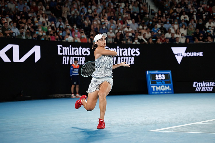 Ash Barty rips a running forehand during the 2022 Australian Open Women’s Singles final. (Photo Credit: Mark Peterson/Tennis Australia)