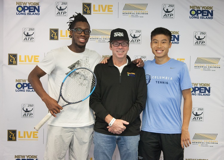 Peter Lebedevs, Assistant Tournament Director of the New York Open (center), with New York Open College Wild Card Invitational finalists, Cornell’s Alafia Ayeni (left) and Columbia’s Jack Lin (right).