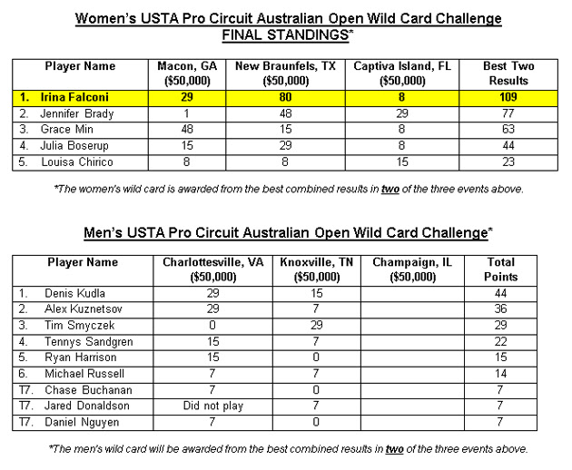 The USTA Pro Circuit Australian Open Wild Card Challenge concludes this week for the men with the $50,000 JSM Challenger of Champaign-Urbana in Champaign, Ill. In the men’s standings, Denis Kudla leads with 44 points after Week Two. Kudla reached the semifinals of the $50,000 Challenger in Charlottesville, Va., two weeks ago, and the quarterfinals of the $50,000 Challenger in Knoxville, Tenn., last week.