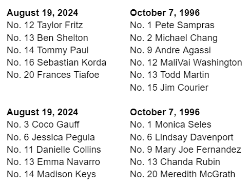 Five American men and five American women are ranked in the Top 20 of the latest ATP and WTA singles rankings, the first time for that since the week of October 7, 1996: