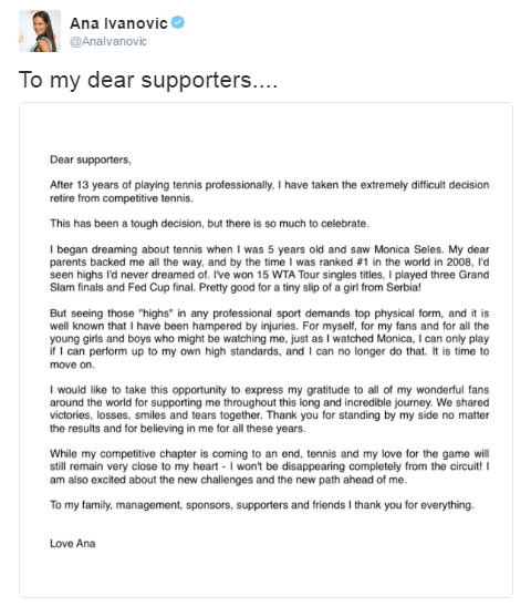 “After 13 years of playing tennis professionally, I have taken the extremely difficult decision to retire from competitive tennis,” Ivanovic posted in a message on her Twitter page. “This has been a tough decision, but there is so much to celebrate.”