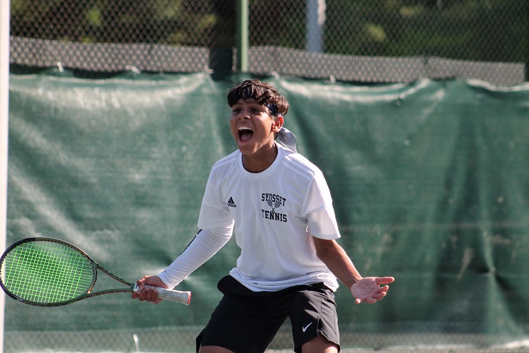 After Syosset grabbed the third doubles point thanks to a 6-3, 6-4 triumph by Aayan Mehta & Ryan Jiang, Roslyn’s Cayden Shen & Bartek Dziedziach notched a 7-5, 6-4 victory at second doubles. Roslyn then heald a 3-2 lead with only the first singles and second singles courts remaining.