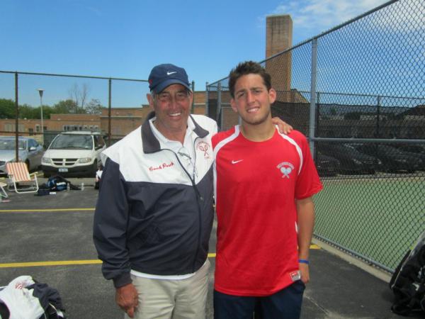Cold Spring Harbor Boys Tennis Coach Paul Poschman congratulates Josh Levine on capturing the 2012 Nassau County Boys Singles High School Championship