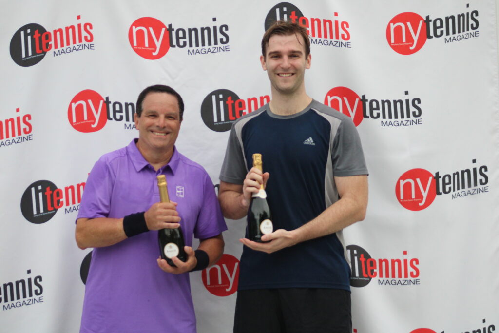 Chris Kolesnik & Neil Hyman repeated as champions in the Men’s Doubles 8.0 – 8.5 division, successfully defending their June title with another win, this time overcoming the windy conditions.Â