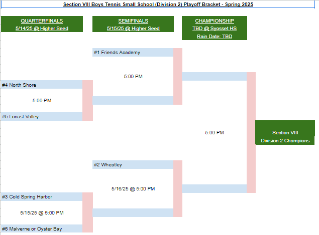 The Nassau County Small School (Division II) playoffs begin on Wednesday. Friends Academy earned the top seed while Wheatley is the number two seed, and each will await their opponent in the semifinals.