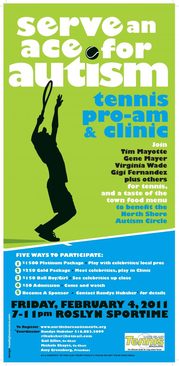 To receive more information, or to find out about sponsorship opportunities, contact Randye Hubsher, the coordinator for The Serve an Ace for Autism Celebrity Tennis Pro-Am and Clinic at (516) 883-5099 or e-mail RLHubsher@hotmail.com. To register for the event, log on to www.northshoreautismcircle.com and follow the links. Other key organizers include Amy Greenberg, president of the North Shore Autism Circle; Gail Siller and Michele Chayet, co-chairs of the event.