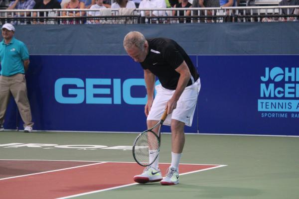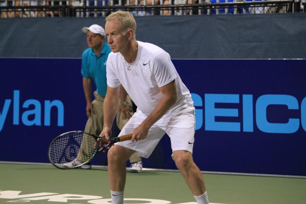 John McEnroe ready to return serve during the mixed-doubles