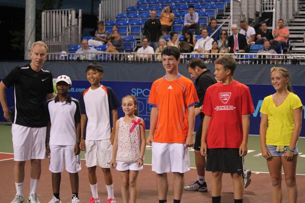 John McEnroe poses with the recipients of John McEnroe Tennis Academy scholarships