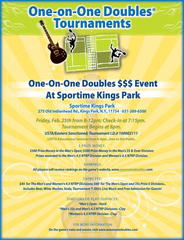 Sportime Kings Park will host a ONE-ON-ONE Doubles Tournament, Friday, Feb. 25 from 8:00 p.m.-midnight. Check-in for the event is 7:15 p.m. and the tournament begins at 8:00 p.m. There will also be a USPTA Educational Seminar prior to the action, from 6:00 p.m.-8:00 p.m., which is free to the public. There will be $500 in prize money available in the Men’s Open Division and $500 in prize money in the Men’s 35 & Over Division. Prizes will also be awarded in the Men’s 4.5 NTRP Division and the Women’s 4.5 NTRP Division.