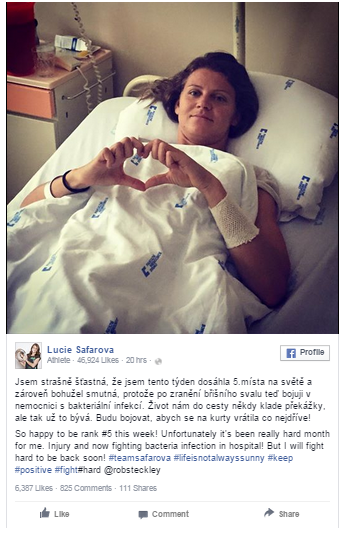 “It’s been really hard month for me,” she wrote. “Injury and now fighting bacteria infection in hospital!”