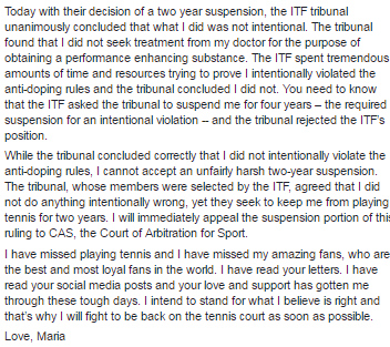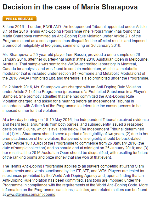 An Independent Tribunal hired by the ITF under the Tennis Anti-Doping Program stated that Sharapova did not indicate her use of Mildronate between 2014-2016 in her forms before the Australian Open. The ITF originally asked for a four-year ban, but the Tribunal came to the conclusion of a two-year ban.