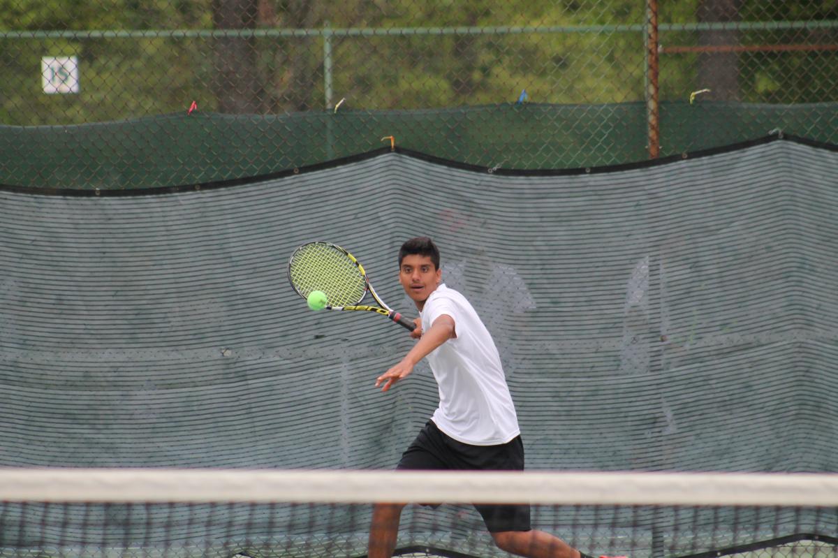 Kabir Rajpal gets ready to rip a forehand during his straight sets win over Sangjin Song at second singles.