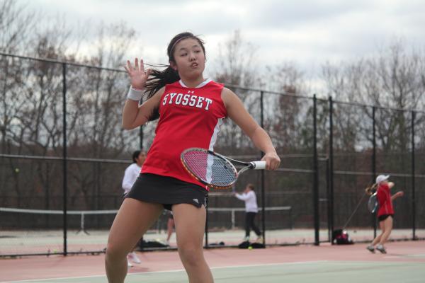 Needing to secure four points for the best of seven win over Suffolk Champions, Half Hollow Hills East, Syosset sent out its undefeated team onto the cold, cloud covered courts of Smithtown West High School. As the players warmed up and play got underway, the sun began to break through the clouds, and it was clear that Syosset was going to jump out to an early lead, taking the first set in all seven matches. Seemingly all at once, the top Syosset doubles teams finished off their opponents as the Syosset players rallied to victory to secure the match. The final match on the court was the second singles battle between Rithika Reddy of Syosset and Allison Huber representing Hills East. Although the match had been decided, Huber was not showing any signs of letting up. With both teams surrounding the courts cheering each points for their respective teammates, Huber brought the second set to a tie-break and won it, sending the match to a deciding 10-point super tie-break. Although she fought hard, Huber was unable to overcome the consistency and resilience of Syosset’s Reddy and fell in the end.