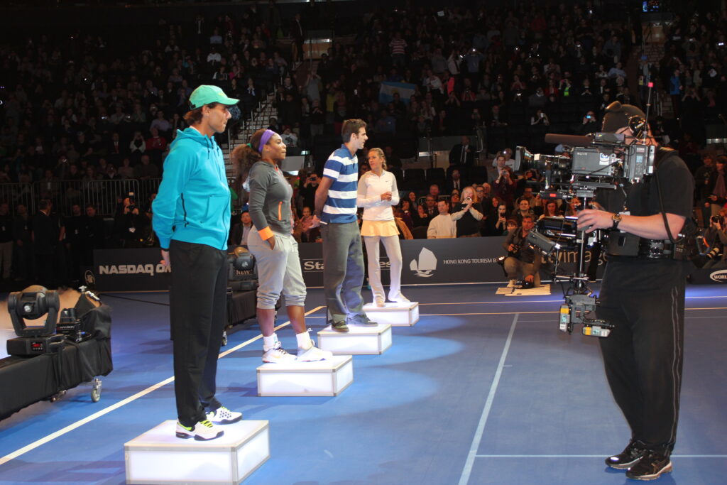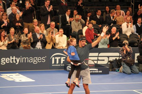 The Nadal-del Potro match was a combination of big forehands with touch shots and crowd pleasing plays mixed in. There were at least a half dozen between-the-legs shots. The match was delayed in the second set when Nadal went in to the crowd and brought actor Ben Stiller on to the court with him. Del Potro then got a young girl sitting courtside to be his partner and a doubles match was born.