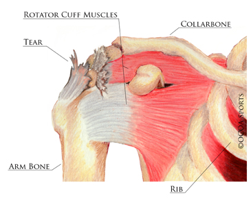 To evaluate for a rotator cuff tear (see right), a doctor will perform an examination after a history is taken. X-rays are performed, and often an MRI is ordered. The X-rays will evaluate the bones in the shoulder, but not the rotator cuff itself. The MRI will show the muscles and tendons around the shoulder and allow the doctor to see the rotator cuff. If the MRI shows a tear in the rotator cuff, then surgery may be recommended.