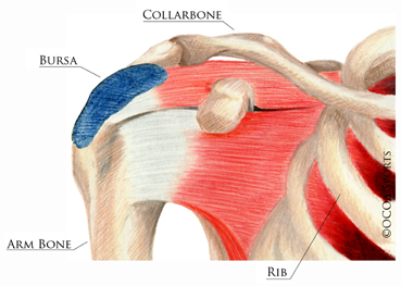 If no tear is present, an MRI may show rotator cuff “tendonitis.” Tendonitis is inflammation of the rotator cuff without tearing. This can be responsible for producing shoulder pain. Tendonitis often occurs with "bursitis.” Bursitis (see left) is inflammation of a fluid filled sac (bursa) on top of the rotator cuff that serves to lubricate the movement of the shoulder. The inflamed bursa can be pinched with overhead activities, causing pain.