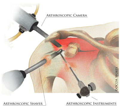 If surgery is recommended, it is usually performed arthroscopically. Arthroscopic surgery (see right) uses small incisions and small tools, about the size of a pencil, to perform the procedure. All the work is visualized with a small camera, the arthroscope. The surgeon sees inside the shoulder with the arthroscope and its images are projected on a video screen.
