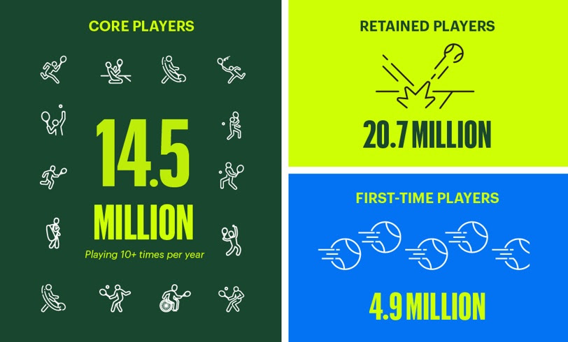 • More first time players entered the sport:Tennis recorded an uptick in new players entering the sport, with 4.9 million picking up a racquet for the first time – up 9 percent year over year.