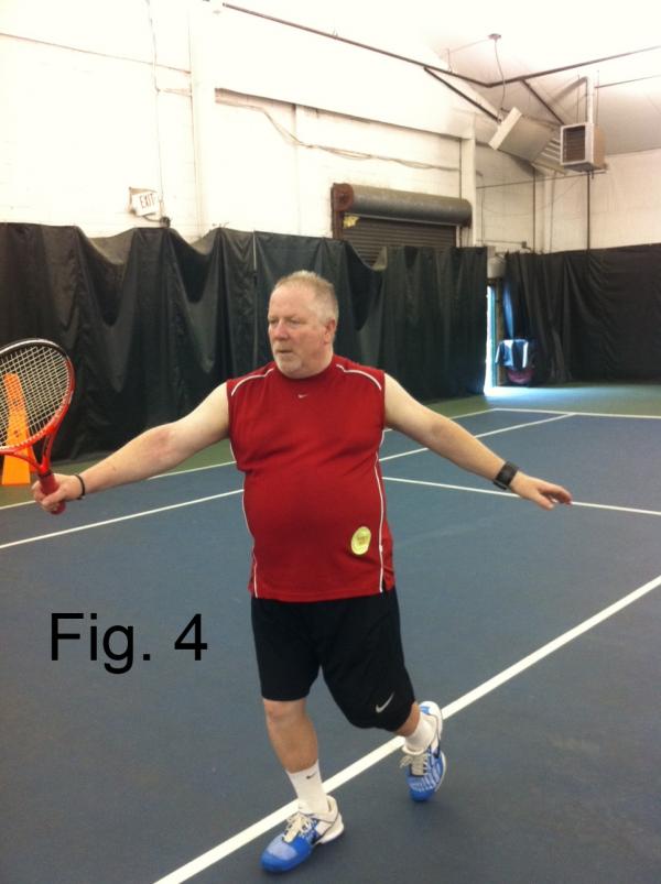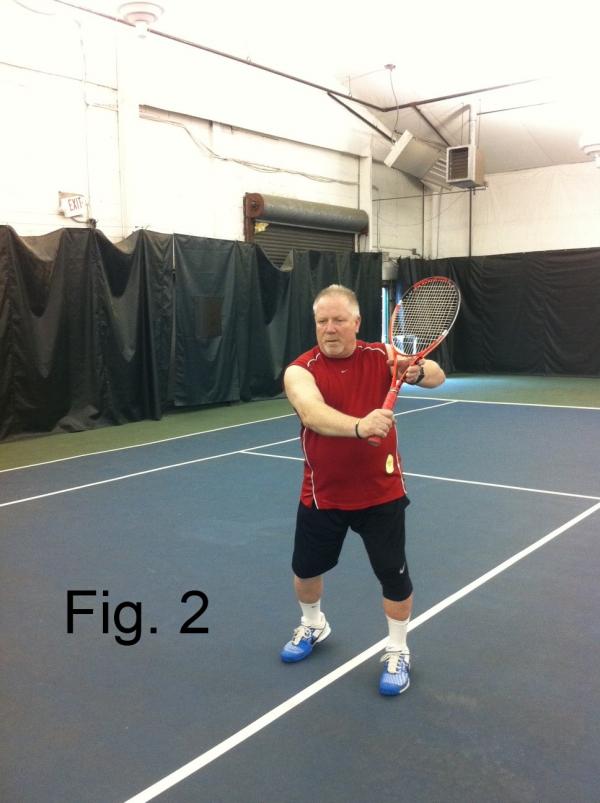 As you turn your right shoulder 90 degrees toward the ball, your weight is now on your left foot. As this happens the racquet is now almost perpendicular. You are ready to swing (see Fig. 2).