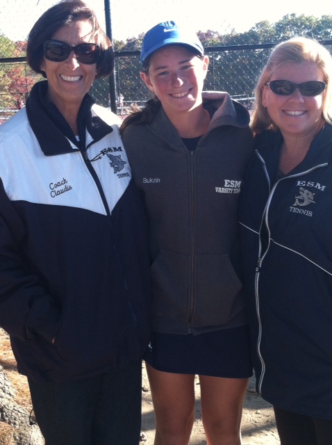 Eighth grader Jackie Bukzin (center) from Eastport/ South Manor Junior High in Manorville, N.Y. made history for her school by being the only tennis player that has made it to States and placing second in Counties. Pictured with Jackie (on the right) is Varsity Coach Sharon Klune and on the left, JV coach Susan Claudio
