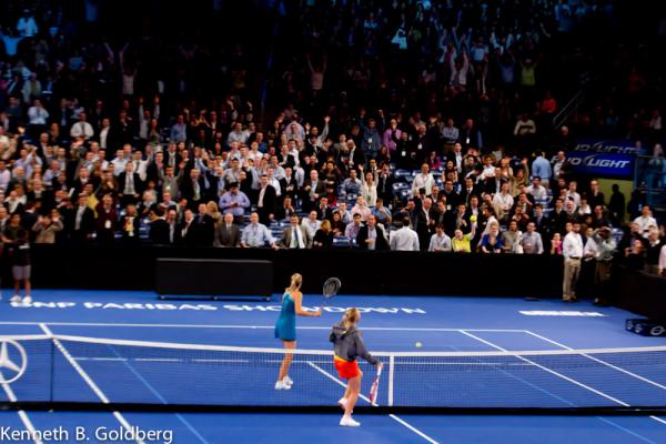 In the opening match of the evening, current world number two-ranked Maria Sharapova of Russia defeated Denmark’s Caroline Wozniacki, 6-3, 6-4. In the second set, Wozniacki embraced the music being played on the loudspeakers during a changeover and began a dance-off with Sharapova. Each invited a fan from the crowd on to the court with them to show their moves.