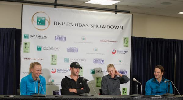 Caroline Wozniacki, Andy Roddick, Maria Sharapova and Roger Federer field questions from the media after the 2012 BNP Paribas Showdown
