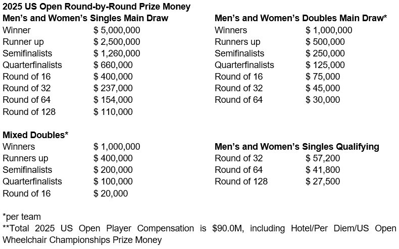 The USTA today announced that the 2025 US Open will once again offer the largest purse in tennis history, being the first tennis event to reach $90 million in total player compensation. This amount tops the total $75 million in 2024, the previous highest purse in tennis history, an increase of 20 percent. Men’s and Women’s Singles Champions at the 2025 US Open will earn $5 million, up 39 percent from the $3.6 million in 2024, making it the largest winning payout in the sport.