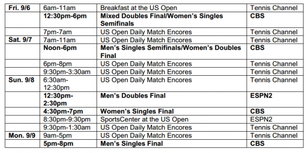 The television schedule for the 2013 US Open Finals Weekend is as follows:
