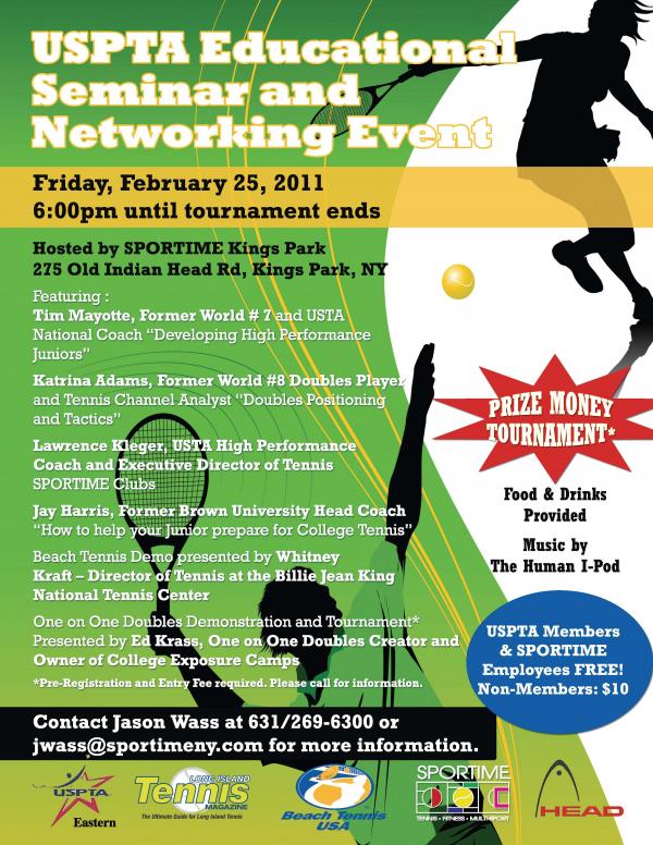 On Friday, Feb. 25, the USPTA will be hosting its Educational Seminar and Networking Event at Sportime Kinks Park, located at 275 Old Indian Head Road in Kings Park, N.Y. This education interactive event will begin at 6:00 p.m. and end when the tournament concludes. Music will be provided by The Human I-Pod, and food and drinks will be provided. USPTA members and Sportime employees are free to attend, and there will be a $10 charge for all other attendees. Pre-registration and an entry fee are required for the ONE-ON-DOUBLES prize money tournament.