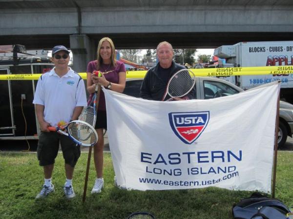 Michael Liu, Marian Morris and Steve Haar show their support for USTA/Eastern-Long Island Region tennis at the Bellmore Family Festival
