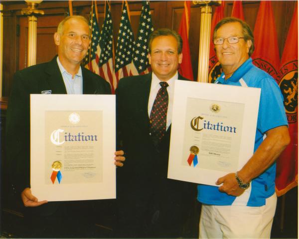USTA/Eastern-LI Region Vice President Michael Pavlides (left) and William Mecca (right), USTA/Eastern Tennis Service Representative, have been honored by Nassau County Executive Edward Mangano (center) for contributing to the health and welfare of Nassau County youth through their efforts in coordinating the 4th Annual Tennis Blitz in the Parks. The event, held in late July, brought nearly 1,000 children to eight different Nassau County parks for free tennis lessons. Conceived and organized by Mecca, along with Karen Beckhard-Ravener from Nassau County’s Parks & Recreation Department, the Blitz teaches children the basics of tennis.