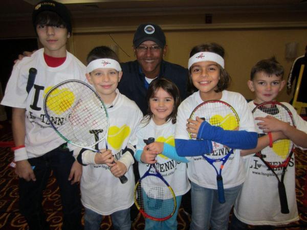 Larry Dillon, USTA Eastern staffer and QuickStart tennis specialist, poses with some of the children in their new "I Love Long Island Tennis" t-shirts donated by the USTA Eastern Long Island board