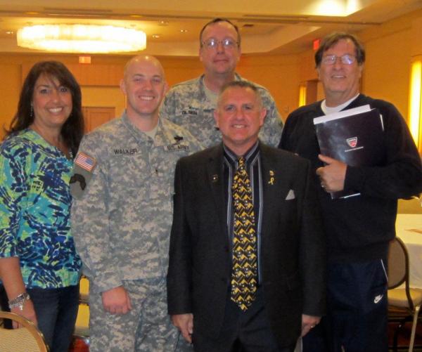 Melanie Rubin (left), USTA Long Island Board Member and Bill Mecca (right) USTA Eastern Long Island Tennis service representative, flank some of the deploying soldiers